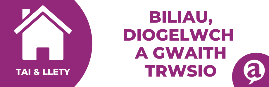 Os nad yw cost y biliau wedi’i gynnwys yn eich rhent, yna rydych chi'n gyfrifol am eu talu lle bo hynny'n berthnasol; nwy, trydan a dwr. Y diwrnod rydych chi'n symud i mewn, gwnewch gofnod o’r rhifau ar y mesuryddion nwy a thrydan a darlleniad eich mesurydd dŵr os oes gennych chi fesurydd; a throsglwyddwch nhw i'r cyflenwyr; fel arall gallech gael eich gorfodi i dalu biliau’r tenantiaid blaenorol.